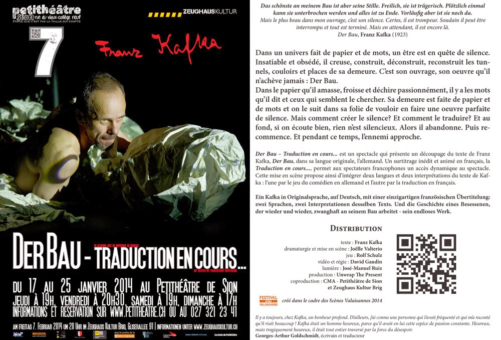 Joëlle Valterio et Rolf Schulz collaborent depuis 2008 dans des performances en Suisse et en Allemagne. Ils sont notamment membres fondateurs du collectif bilingue Die Hungrigen/Les Affamés. En 2011 ils mettent en scène Ein Bericht für eine Akademie et mènent depuis une recherche performative sur d'autres textes de Kafka: à l'aide de structures d'improvisation, ils examinent le rapport entre mouvement, langues, parole et écriture, dans des espaces réels et imaginaires. A l'issue d'une semaine de recherche intensive en décembre 2012 au Maschinenhaus de Essen en Allemagne, ils créent une performance interdisciplinaire mêlant mouvement, textes, conférence et musique: Im Bau. De cette recherche performative sur Kafka et de l'intérêt du Petithéâtre de Sion de présenter un spectacle en allemand au public sédunois dans le cadre des Scènes valaisannes 2014, est née l’idée de créer le spectacle Der Bau – Traduction en cours....Dossier
